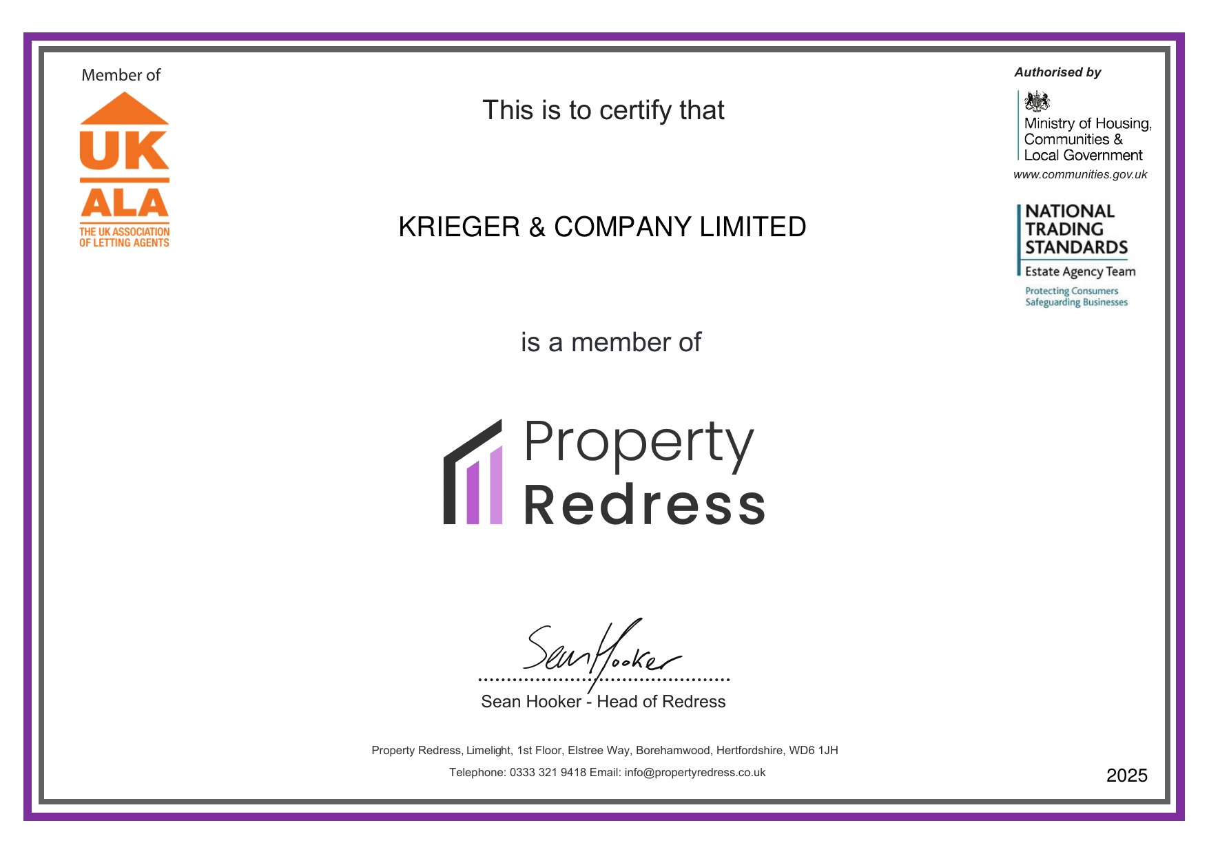 Our 2025 membership certificate for the Property Redress Scheme — a government approved redress scheme.